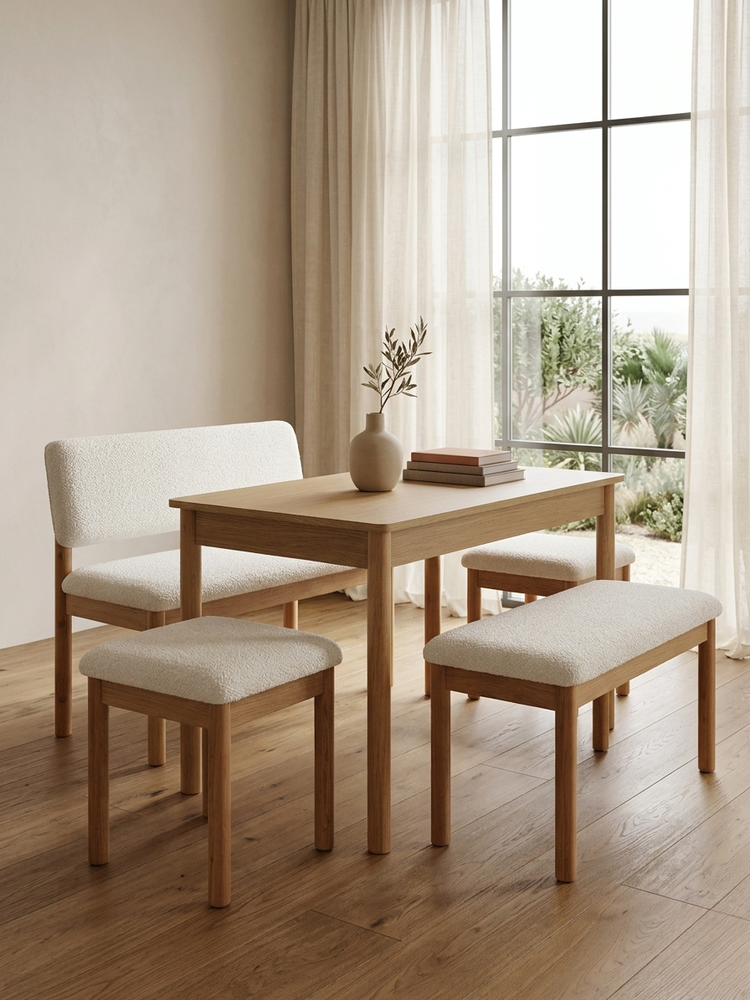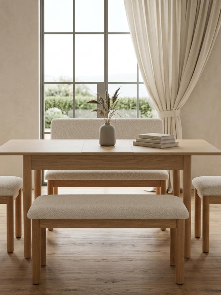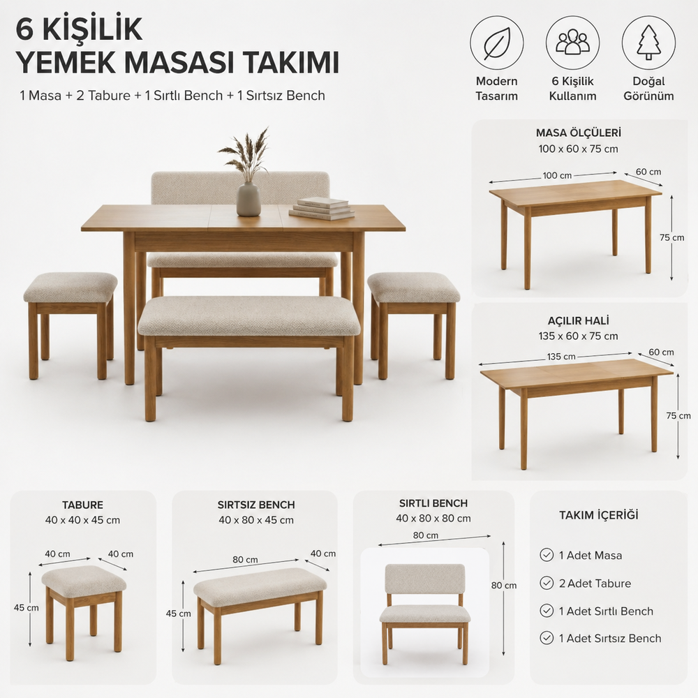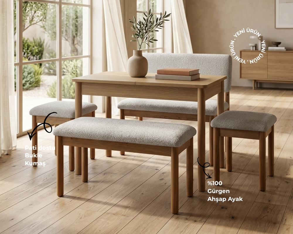 Mood Minimal 2 Tabure 1 Sırtlı Bench 1 Sırtsız Bench Mutfak Masa TakımıÜrün ÖzellikleriMasa: 100x60x75Masa Açık : 135 x 60 x 75Sırtlı Bench: 40 x 80 x 80Sırtsız Bench: 40 x 80 x 45Tabure: 40 x 40 x 45Kumaş : Bukle / KremMood Minimal 2 Tabure 1 Sırtlı Bench 1 Sırtsız Bench Mutfak Masa Takımı; evinizin mutfak alanına düzen, konfor ve şık bir görünüm kazandırmak için tasarlanmış pratik bir oturma setidir. Farklı oturma seçenekleri sayesinde misafirlerinizi ağırlarken ya da günlük öğünlerinizi paylaşırken dar alanlarınızı en verimli şekilde kullanabilirsiniz.Set içerisinde 2 tabure, 1 sırtlı bench ve 1 sırtsız bench bulunur. Sırtlı bench uzun oturumlarda daha iyi destek sunarken, sırtsız bench daha esnek yerleşim sağlayarak mutfak düzeninizi kolayca uyarlamanıza yardımcı olur. Böylece hem rahat hem de fonksiyonel bir yemek deneyimi elde edersiniz.Farklı oturma düzeni imkânı: Sırtlı ve sırtsız bench kombinasyonu ile oturum alanınızı ihtiyacınıza göre şekillendirin.Günlük konfor: Sırtlı bench sayesinde yemek başında daha rahat bir kullanım deneyimi yaşayın.Paylaşımı kolaylaştıran set: Tabureler ve bench’ler sayesinde ailecek sofraya oturmayı daha pratik hale getirin.Mutfak alanını toparlayan görünüm: Takım tasarımı sayesinde dağınık görüntüyü azaltır, estetik bir bütünlük sağlar.Pratik kullanım: Mutfakta yerden tasarruf ederek düzenli bir oturma alanı oluşturmanıza destek olur.Evinde sıcak bir yemek köşesi oluşturmak isteyenler için ideal olan Mood Minimal mutfak masa takımıyla hem oturma düzeninizi yenileyin hem de misafirlerinizi en iyi şekilde ağırlayın. Şimdi seti inceleyin ve mutfağınıza konforu ekleyin.