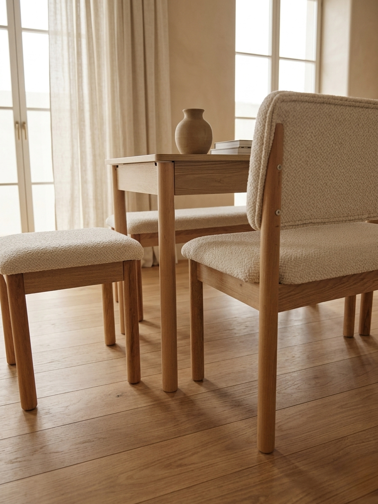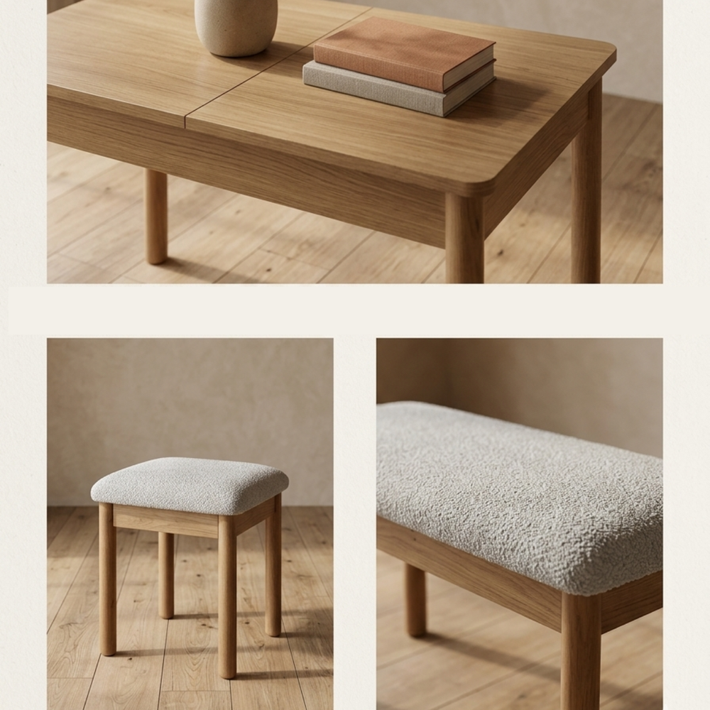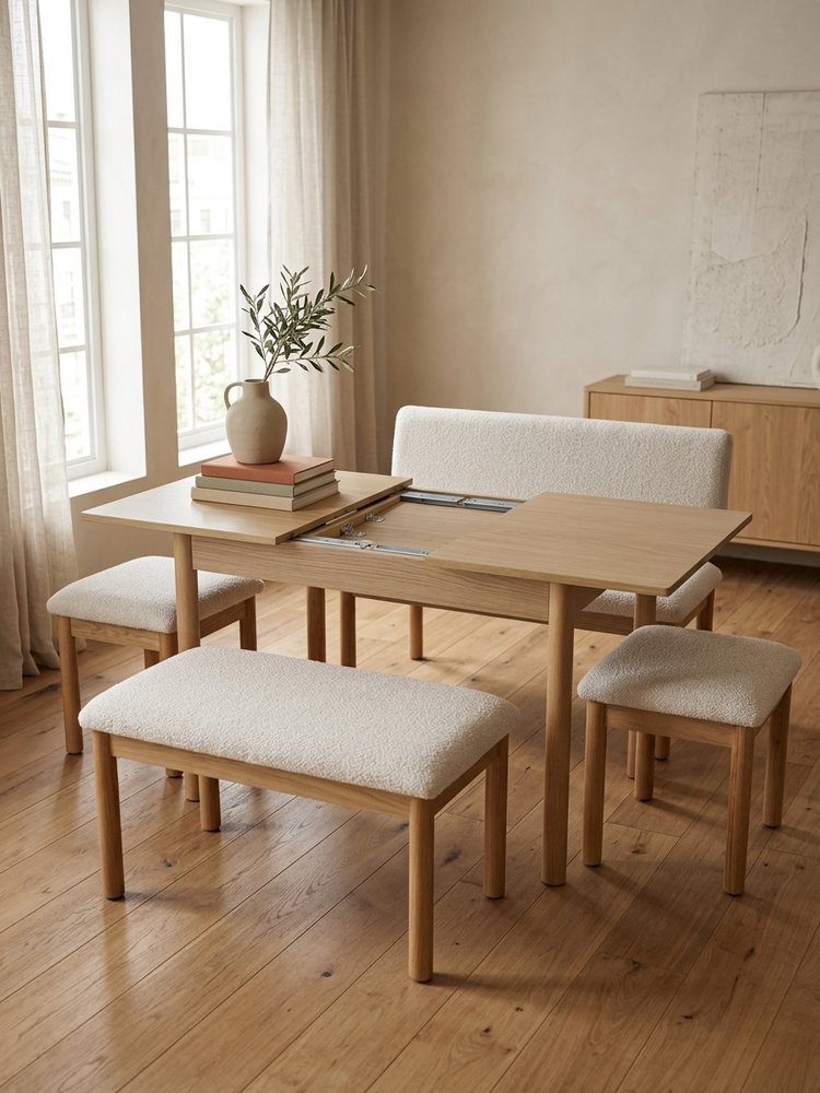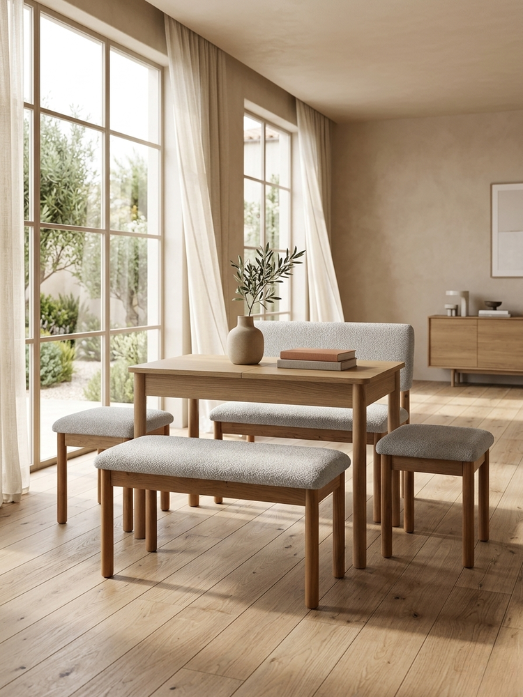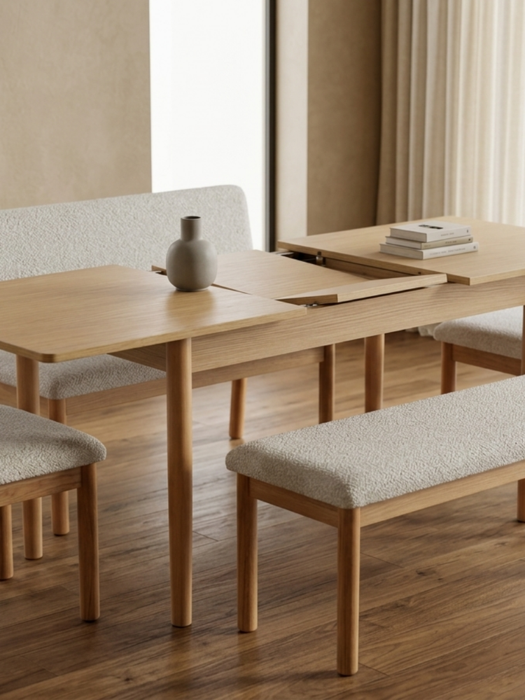 Mood Minimal 2 Tabure 1 Sırtlı Bench 1 Sırtsız Bench Mutfak Masa TakımıÜrün ÖzellikleriMasa: 100x60x75Masa Açık : 135 x 60 x 75Sırtlı Bench: 40 x 80 x 80Sırtsız Bench: 40 x 80 x 45Tabure: 40 x 40 x 45Kumaş : Bukle / KremMood Minimal 2 Tabure 1 Sırtlı Bench 1 Sırtsız Bench Mutfak Masa Takımı; evinizin mutfak alanına düzen, konfor ve şık bir görünüm kazandırmak için tasarlanmış pratik bir oturma setidir. Farklı oturma seçenekleri sayesinde misafirlerinizi ağırlarken ya da günlük öğünlerinizi paylaşırken dar alanlarınızı en verimli şekilde kullanabilirsiniz.Set içerisinde 2 tabure, 1 sırtlı bench ve 1 sırtsız bench bulunur. Sırtlı bench uzun oturumlarda daha iyi destek sunarken, sırtsız bench daha esnek yerleşim sağlayarak mutfak düzeninizi kolayca uyarlamanıza yardımcı olur. Böylece hem rahat hem de fonksiyonel bir yemek deneyimi elde edersiniz.Farklı oturma düzeni imkânı: Sırtlı ve sırtsız bench kombinasyonu ile oturum alanınızı ihtiyacınıza göre şekillendirin.Günlük konfor: Sırtlı bench sayesinde yemek başında daha rahat bir kullanım deneyimi yaşayın.Paylaşımı kolaylaştıran set: Tabureler ve bench’ler sayesinde ailecek sofraya oturmayı daha pratik hale getirin.Mutfak alanını toparlayan görünüm: Takım tasarımı sayesinde dağınık görüntüyü azaltır, estetik bir bütünlük sağlar.Pratik kullanım: Mutfakta yerden tasarruf ederek düzenli bir oturma alanı oluşturmanıza destek olur.Evinde sıcak bir yemek köşesi oluşturmak isteyenler için ideal olan Mood Minimal mutfak masa takımıyla hem oturma düzeninizi yenileyin hem de misafirlerinizi en iyi şekilde ağırlayın. Şimdi seti inceleyin ve mutfağınıza konforu ekleyin.