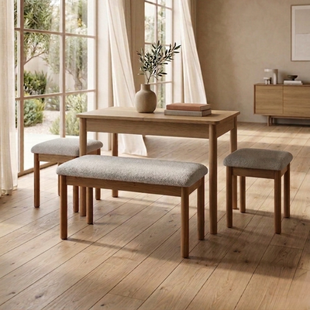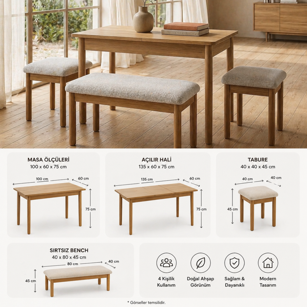 Mood Minimal 2 Tabure 1 Sırtsız Bench Mutfak Masa TakımıÜrün ÖzellikleriMasa: 100 x 60 x 75Masa Açık : 135 x 60 x 75Sırtsız Bench: 40 x 80 x 45Tabure: 40 x 40 x 45Kumaş : Bukle / KremMood Minimal 2 Tabure 1 Sırtsız Bench Mutfak Masa Takımı; evinizin mutfak alanına düzen, konfor ve şık bir görünüm kazandırmak için tasarlanmış pratik bir oturma setidir. Farklı oturma seçenekleri sayesinde misafirlerinizi ağırlarken ya da günlük öğünlerinizi paylaşırken dar alanlarınızı en verimli şekilde kullanabilirsiniz.Set içerisinde 2 tabure ve 1 sırtsız bench bulunur. Sırtsız bench esnek yerleşim sağlayarak mutfak düzeninizi kolayca uyarlamanıza yardımcı olur. Böylece hem rahat hem de fonksiyonel bir yemek deneyimi elde edersiniz.Farklı oturma düzeni imkânı: Tabure ve sırtsız bench kombinasyonu ile oturum alanınızı ihtiyacınıza göre şekillendirin.Paylaşımı kolaylaştıran set: Tabureler ve bench sayesinde ailecek sofraya oturmayı daha pratik hale getirin.Mutfak alanını toparlayan görünüm: Takım tasarımı sayesinde dağınık görüntüyü azaltır, estetik bir bütünlük sağlar.Pratik kullanım: Mutfakta yerden tasarruf ederek düzenli bir oturma alanı oluşturmanıza destek olur.Evinde sıcak bir yemek köşesi oluşturmak isteyenler için ideal olan Mood Minimal mutfak masa takımıyla hem oturma düzeninizi yenileyin hem de misafirlerinizi en iyi şekilde ağırlayın. Şimdi seti inceleyin ve mutfağınıza konforu ekleyin.