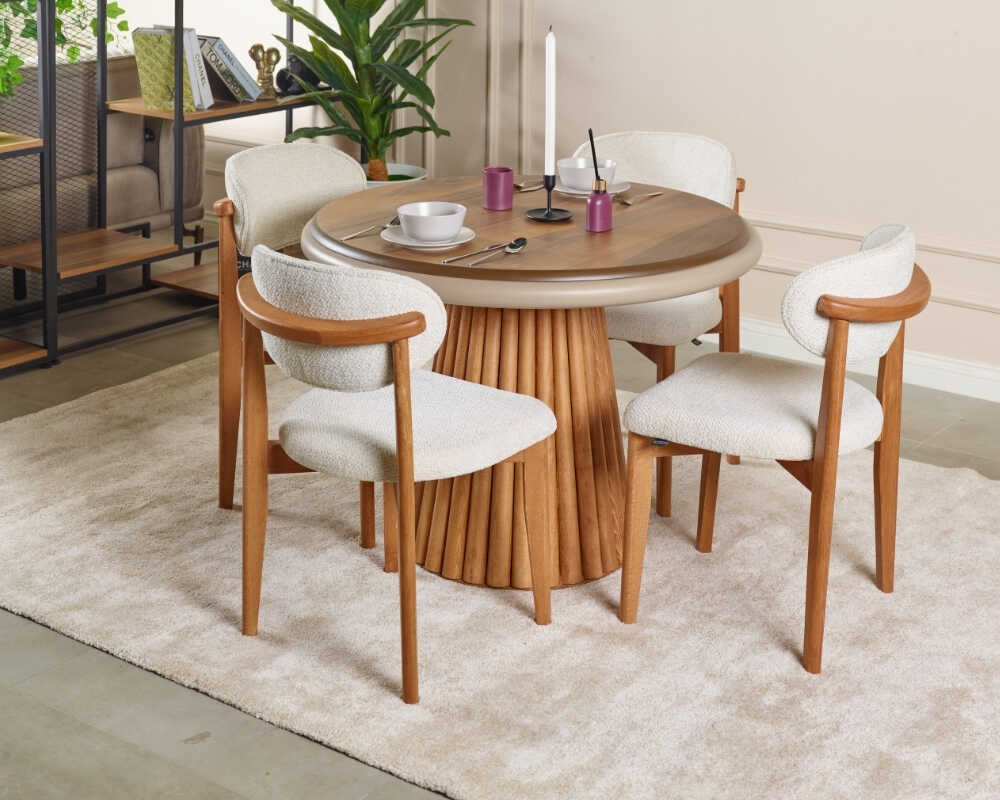 Görselde görüldüğü gibi, Somera (Yuvarlak) Masa Takımı, ceviz kaplama MDF masası ve sağlam gürgen ayakları ile zarif bir görünüm sunar. Sandalyelerdeki hazeran sırt detayları, hem modern hem de klasik dekorasyon tarzlarına uyum sağlayarak doğal ve İskandinav bir hava katıyor. Papel oturma alanı ve sırt kısmı, uzun oturumlar için konfor sağlarken, dayanıklılığı ile de uzun ömürlü kullanım vaat ediyor.Bu masa takımı, 4 kişilik oturum kapasitesi ile hem aile yemekleri hem de arkadaş buluşmaları için idealdir. Somera (Yuvarlak) Masa Takımı, yemek odanızı şık ve davetkar bir alana dönüştürmek için mükemmel bir tercihtir. Şimdi bu özel tasarımı keşfedin ve evinize zarafet katın!SOMERA (Yuvarlak) Neden Seçmelisiniz?Evinize hem zarafet hem de konfor katacak bir masa takımı arıyorsanız, Somera (Yuvarlak) Masa Takımı tam size göre! İşte Somera (Yuvarlak) Takımını seçmeniz için bazı nedenler:- Orta Boyutlu Mekanlar İçin İdeal:Somera (Yuvarlak) , özellikle orta boyutlu yemek odaları ve mutfaklar için mükemmel bir seçimdir. 4 kişilik oturum kapasitesi ile hem aile yemekleri hem de arkadaş buluşmalarında ideal bir uyum sağlar, alanınızı verimli kullanmanıza olanak tanır.